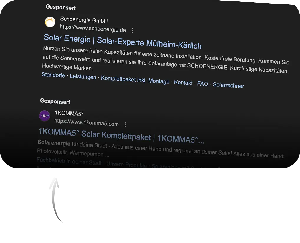 Warum? Weil wir deine potenziellen Kunden genau dann erreichen, wenn sie aktiv nach einem Photovoltaik-Dienstleister suchen.